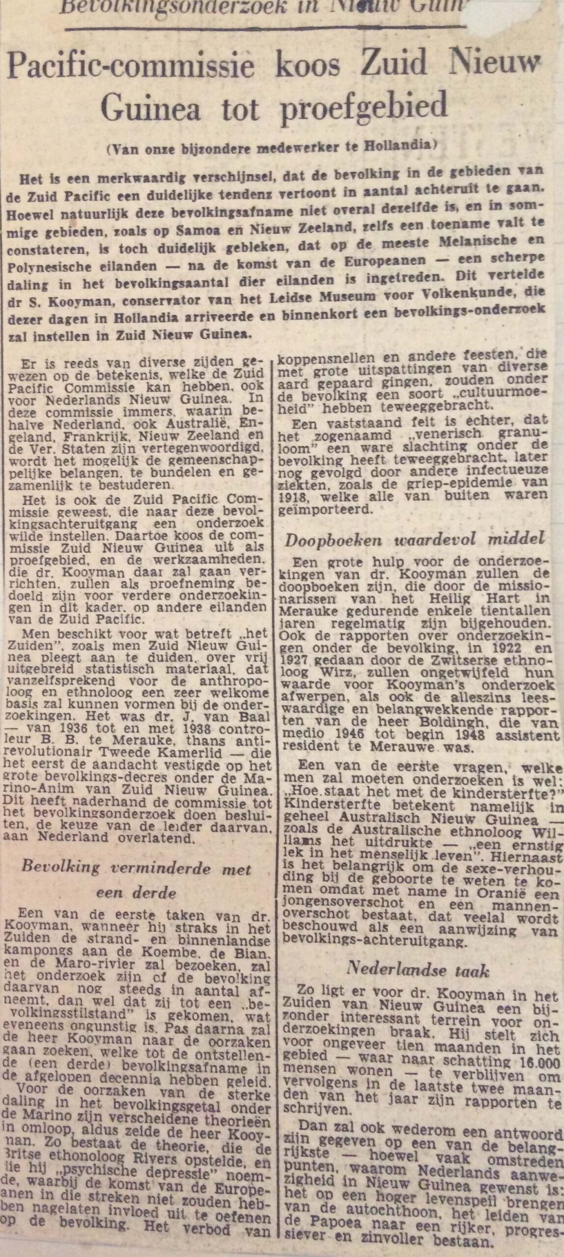 Het is ook de Zuid Pacific Commissie geweest die naar deze bevolkingsachteruitgang een onderzoek wilde instellen. Daartoe koos de commissie Zuid-Nieuw-Guinea uit als proefgebied en de werkzaamheden, die dr. Kooyman daar zal gaan verrichten zullen als proefneming bedoeld zijn voor verdere onderzoekingen in dit kader, op andere eilanden van de Zuid Pacific.
